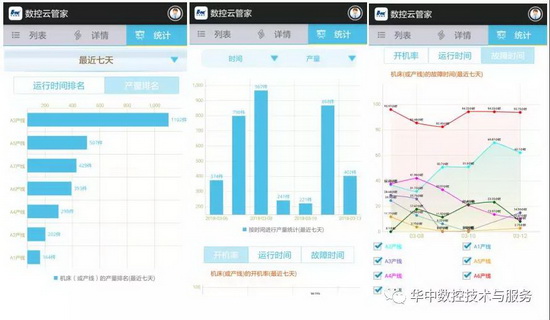? ? ? 目前,華中數控已在全國部署iNC Cloud云管家服務,通過“云管家”app和web網頁,可實時查看車間每條生產線中機床的當前運行狀態,記錄了每個機床的今日產量,為用戶提供車間、機床相關利用率、開機率、運行率、利用率、加工件數和報警次數等統計報表,用戶可依據機床使用率等數據,合理排序或調整每臺機床加工零件的工序,可大幅度提高產品加工效率,節約人力、物力資源。